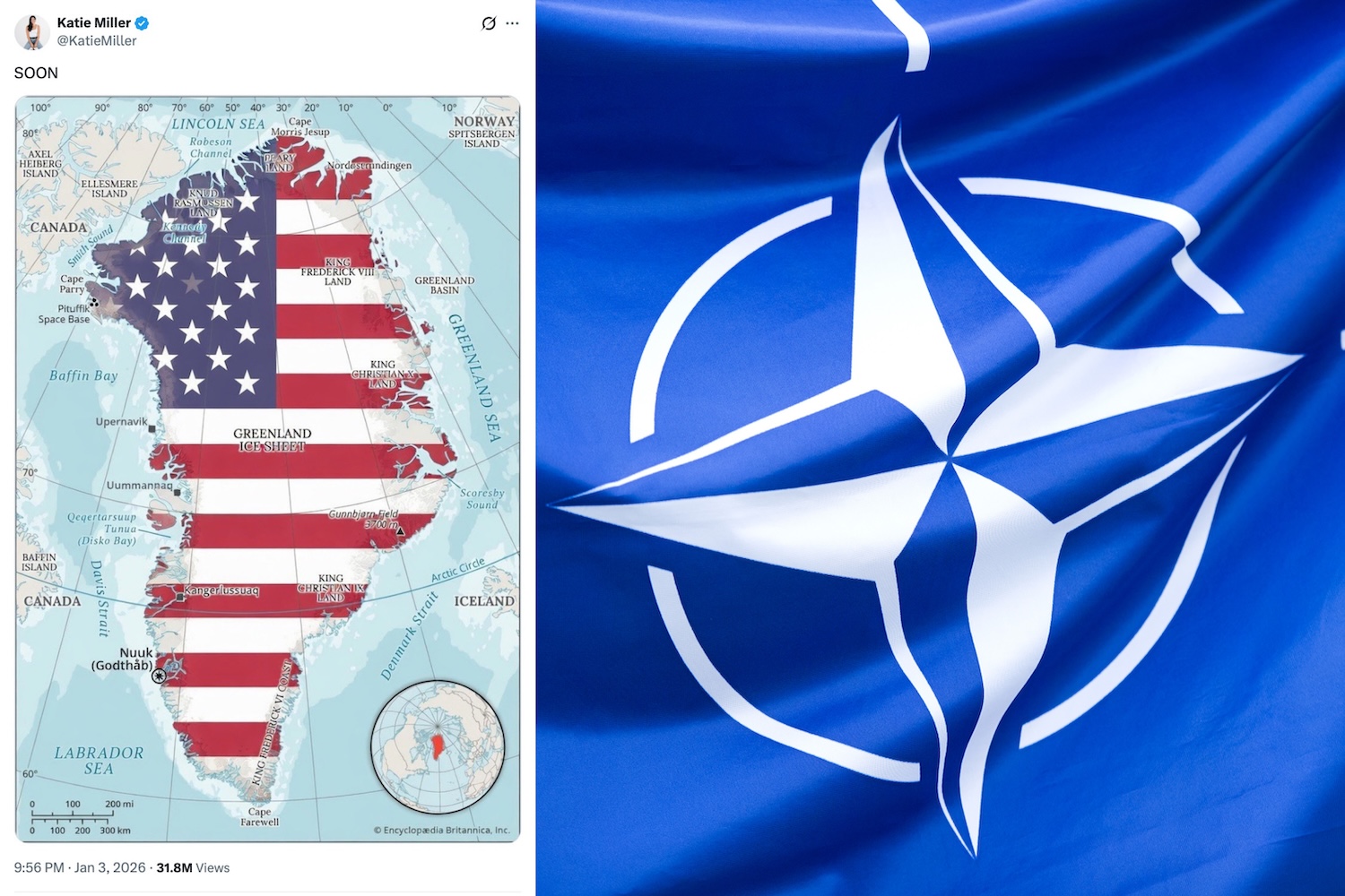 Valge Maja personaliülema asetäitja ja sisejulgeolekunõunik Stephen Miller kaitses intervjuus CNN-ile USA viimase aja tegevust läänepoolkeral, sealhulgas Venezuela presidendi Nicolás Maduro kinnipidamist ja ähvardusi võtta üle Gröönimaa (vt kokkuvõtet siit). Seejuures pälvis alles mõne päeva eest palju tähelepanu Milleri abikaasa Katie Milleri sotsiaalmeediapostitus, milles esitatud pildil oli Gröönimaa värvitud USA lipu värvidesse ja sinna juurde oli lisatud kommentaar “VARSTI”.